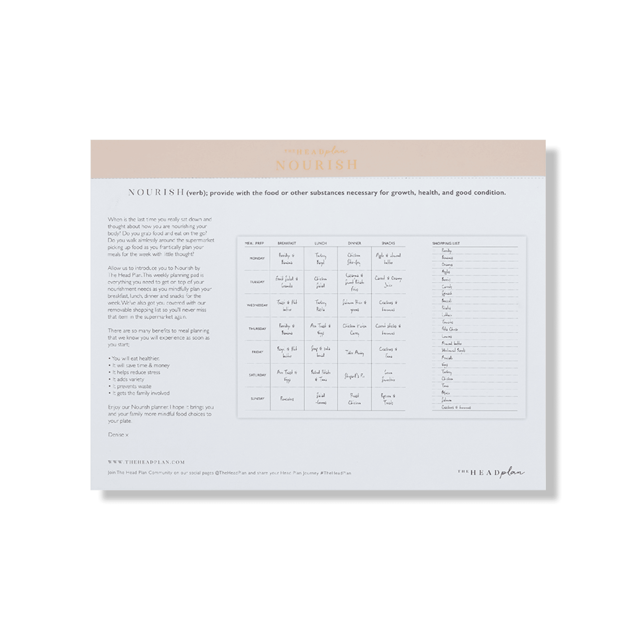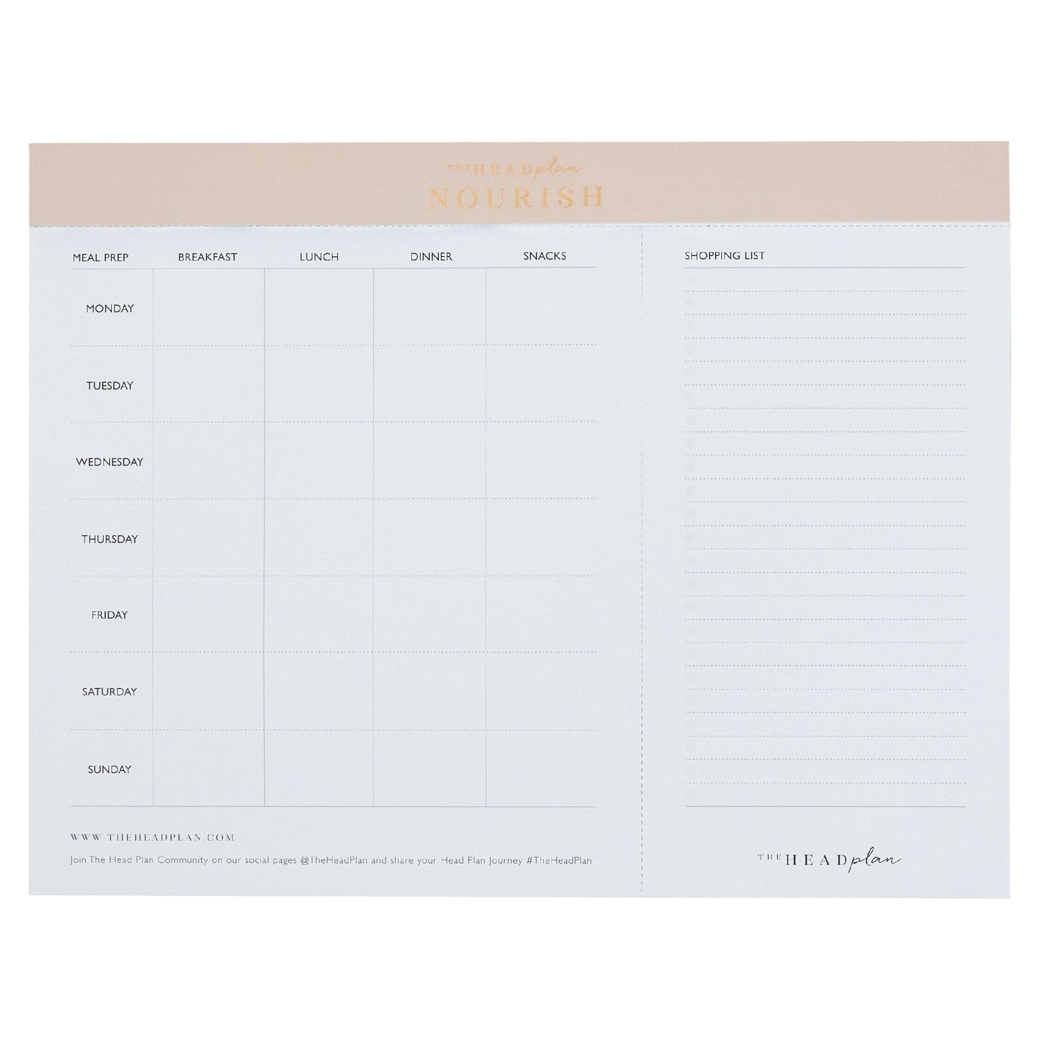 Allow us to introduce you to Nourish by The Head Plan. This weekly planning pad is everything you need to get you on top of your nourishment needs as you mindfully plan your breakfast, lunch, dinner and snacks for the week. We've also got you covered with our removable shopping list so you'll never miss that item in the supermarket again.